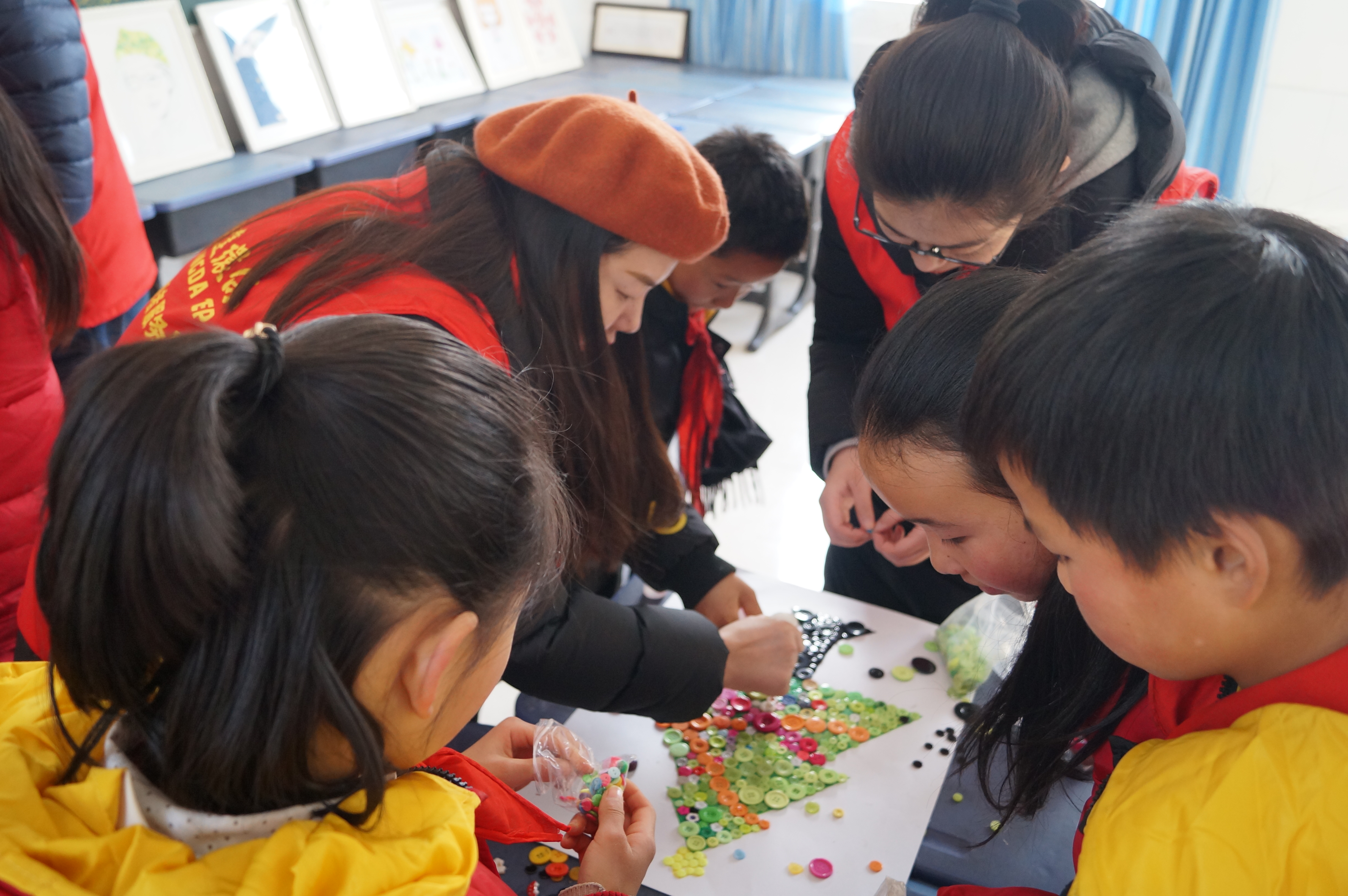 活動期間,誌願者們(men) 與(yu) 孩子們(men) 展開了親(qin) 密的互動交流。有的跟著孩子們(men) 學習(xi) 紐扣手工製作“絕技”,有的與(yu) 孩子們(men) 載歌載舞、玩遊戲,有的與(yu) 孩子們(men) 暢談未來、暢聊夢想,為(wei) 孩子們(men) 解惑答疑……誌願者們(men) 看著孩子們(men) 一張張洋溢著明亮、幸福的笑臉,天氣雖寒心卻很暖……孩子們(men) 或依偎、或團坐在誌願者們(men) 的周圍,像朋友一樣親(qin) 密無間,時而與(yu) 誌願者們(men) 竊竊私語,時而開懷大笑,整個(ge) 校園猶如陽春三月般溫暖。最後,孩子們(men) 不僅(jin) 向集團領導和誌願者們(men) 敬獻紅領巾,還向集團公司贈送了象征著友誼的紐扣手工作品。