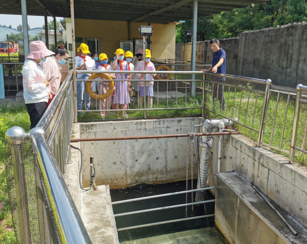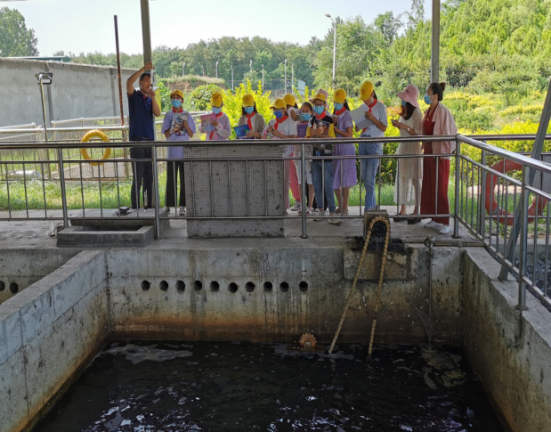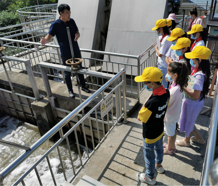 參觀前新中洲一廠副廠長李廣輝給老師和同學們(men) 分享了汙水的來源,讓大家對汙水有一個(ge) 正麵的認知。李廠長先後帶領大家參觀了粗格柵、細格柵、生化池、加藥間、二沉池、纖維轉盤等設施,並對整個(ge) 處理流程用簡要易懂的語句給大家進行了講解。當講到粗格柵的作用是打撈大量的垃圾時,又特別為(wei) 大家講解從(cong) 小養(yang) 成不亂(luan) 扔垃圾、垃圾分類處理的好習(xi) 慣,從(cong) 而減少汙染。走到生化池好氧段,大家看到又髒又臭的泥水,李廠長耐心地告訴大家這些泥水裏有著汙水處理中需要各種微生物,它們(men) 是通過我們(men) 的鼓風機及曝氣係統給它們(men) 供氧保證它們(men) 的活性,來吃掉那些汙染物。更讓孩子們(men) 驚訝是二沉池的作用,剛剛還是泥水混合在一起,一瞬間又變成了清水。通過李廠長的耐心講解孩子們(men) 聽得津津有味,李廠長用量筒取了出水水樣讓孩子們(men) 更直觀看到了汙水是怎樣變成一汪清水的過程。