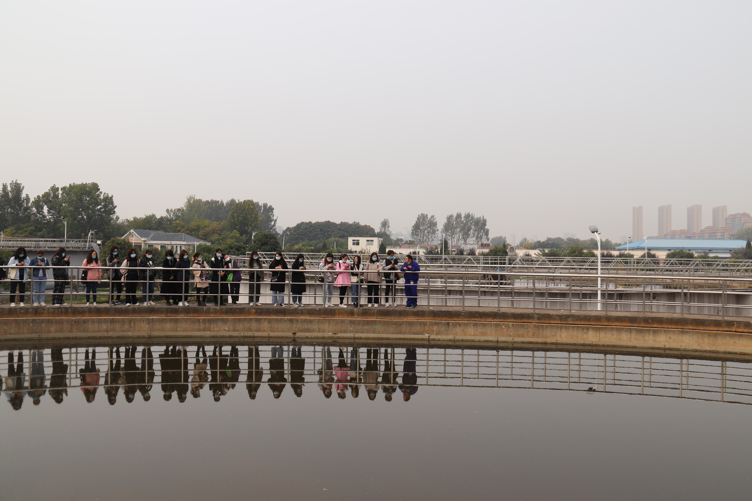 作為(wei) 本次參觀的講解員,運營部部長盧太平帶領同學們(men) 從(cong) 觀看工藝流程圖開始,先後參觀了進水口粗細格柵、旋流沉砂池、二沉池、高效濾池消毒池、汙泥脫水車間、出水口等等,盧部長對工藝流程及每一個(ge) 階段的處理原理都進行了詳細的闡述,使大家充分了解了生活汙水由黑臭變清澈的全部過程。